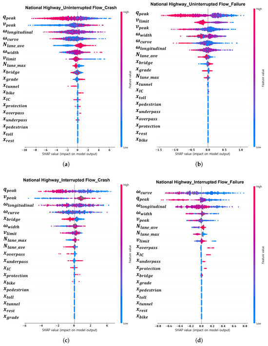 SHAP value analysis of XGBoost model by flow condition and dependent variable for national highways: (a) uninterrupted flow—HDV crashes; (b) uninterrupted flow—AV failures; (c) interrupted flow—HDV crashes; (d) interrupted flow—AV failures.