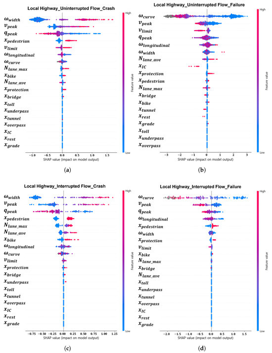 SHAP value analysis of XGBoost model by flow condition and dependent variable for local highways: (a) uninterrupted flow—HDV crashes; (b) uninterrupted flow—AV failures; (c) interrupted flow—HDV crashes; (d) interrupted flow—AV failures.