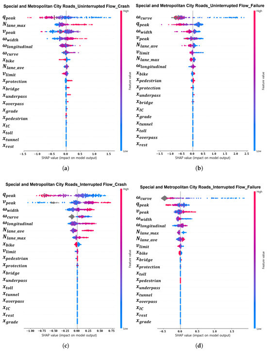 SHAP value analysis of XGBoost model by flow condition and dependent variable for special and metropolitan city roads: (a) uninterrupted flow—HDV crashes; (b) uninterrupted flow—AV failures; (c) interrupted flow—HDV crashes; (d) interrupted flow—AV failures.