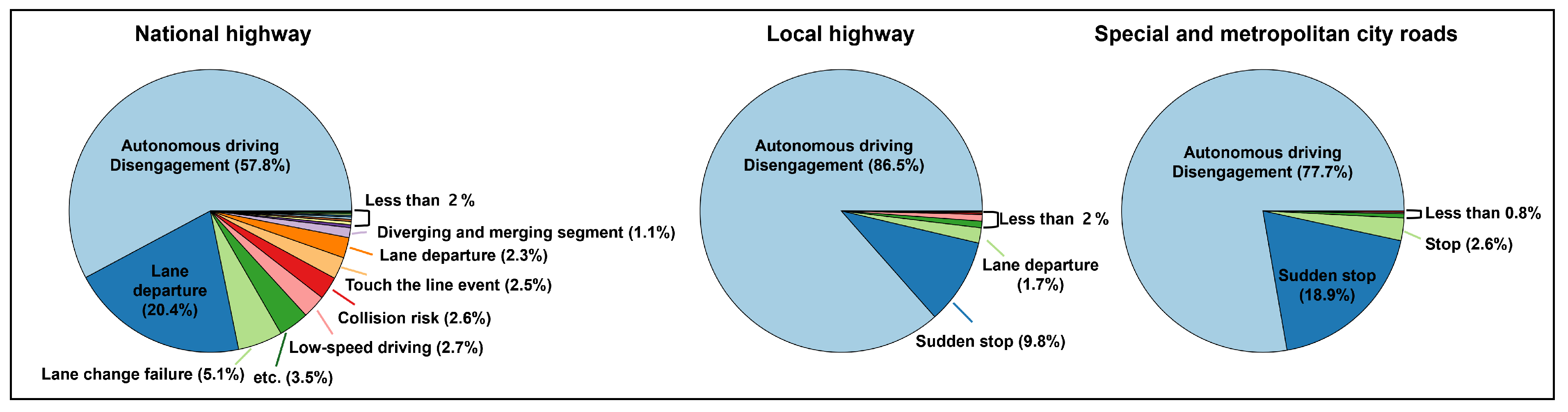 - Woo, S.; Woo, B.; Chang, Y.; Tak, S. Road Design on Human Driver Accidents vs. Automated Vehicle Failures: Comparison with Real-World Field Data. IEEE Access 2024, 12, 159545–159560. [Google Scholar] [CrossRef]
