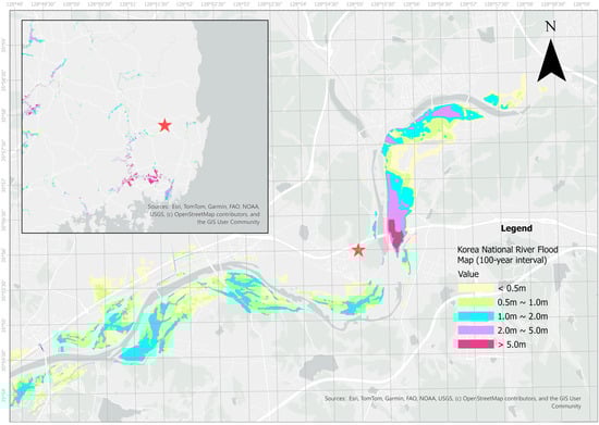 Map showing the spatial distribution of flood inundation depth derived from the Korea National River Flood Map (100-year recurrence interval) around the study area near Gyeongju, South Korea. The colored zones represent estimated inundation depths, classified into six ranges: less than 0.5 m, 0.5–1.0 m, 1.0–2.0 m, 2.0–5.0 m, and greater than 5.0 m. The red stars denote the key observation and analysis sites used in this study. The inset map provides the regional context within the southeastern Korean Peninsula, indicating the location of the detailed study region relative to surrounding hydrological networks. Basemap sources include Esri, TomTom, Garmin, FAO, NOAA, and USGS, as well as OpenStreetMap contributors and the GIS User Community.
