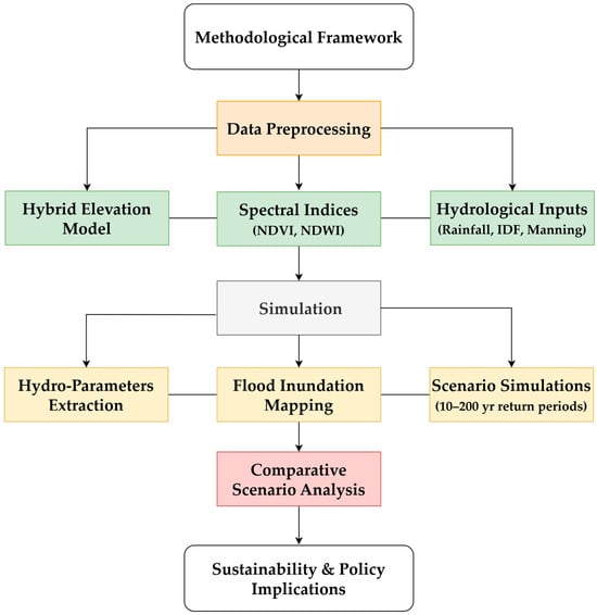 Simplified methodological framework for the flood hazard and risk assessment, integrating spectral, hydrological, and simulation components toward sustainability and policy implications.