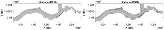 Hillshade comparison of (left) Digital Elevation Model (DEM) and (right) Digital Surface Model (DSM) for the Yongcheon stream basin. The DEM hillshade reveals smooth bare-earth channel morphology and floodplain topography, while the DSM hillshade exhibits surface texture from vegetation, embankments, and structures. The contrasting representations demonstrate the complementary information content of each dataset, which informed the construction of the Hybrid elevation model used for flood simulations.