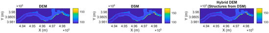Elevation comparison of (left) DEM, (center) DSM, and (right) Hybrid DEM for the Yongcheon stream basin. Color scale represents elevation in meters above mean sea level. The DEM shows bare-earth terrain, the DSM includes all surface features, and the Hybrid model selectively integrates structural features from the DSM while filtering out vegetation. Note the elevated embankments preserved in the Hybrid model (particularly visible in the eastern portion near X ≈ 4.97 × 105 m), which substantially influence flood conveyance and overbank flow dynamics.