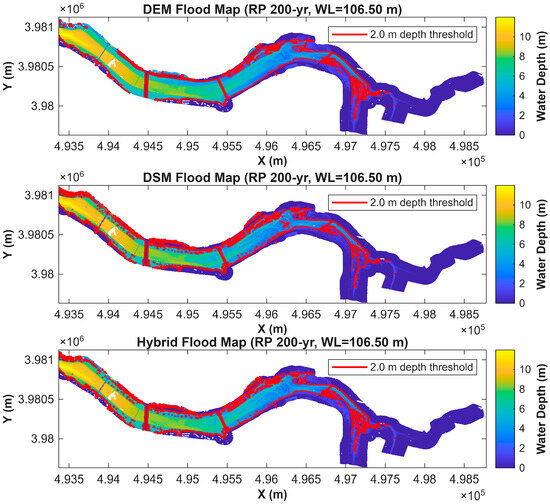 Comparison of flood inundation maps generated under different return periods (RPs = 10, 30, 50, 100, and 200 years) using three topographic representations: left column—DEM-based simulations, middle column—DSM-based simulations, and right column—hybrid DEM–DSM simulations. Each row corresponds to a specific return period, increasing from top (10-yr) to bottom (200-yr). Water depth is illustrated by the color scale (0–10 m), where blue indicates shallow inundation and yellow indicates deeper flood zones. The red contour line delineates the 2.0 m water depth threshold, used to identify hazardous flooding areas relevant for risk assessment. The comparison highlights differences in flood extent and depth estimation between DEM, DSM, and hybrid approaches across multiple design events.