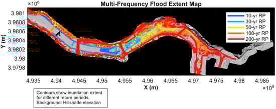 Multi-frequency flood extent map showing progressive inundation boundaries for five return periods (10, 30, 50, 100, 200 years) as nested contours on hillshade background. Blue (10-yr) represents frequent localized flooding; yellow (50-yr) indicates moderate impacts; orange (100-yr) shows extension into residential areas; red (200-yr) depicts extreme conditions. The nested pattern demonstrates non-linear escalation of flood hazard with increasing return period.