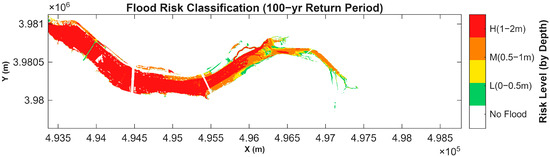 To support emergency planning and risk communication, a depth-based risk classification was developed for the 100-year return period scenario (Figure 8, Table 1). This approach provides actionable thresholds aligned with evacuation protocols and infrastructure vulnerability.