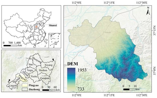 Location Map of Pingyao County, DEM = Digital Elevation Model, Elevation 733–1953 (m) (Source: drawn by Qiang Wang).