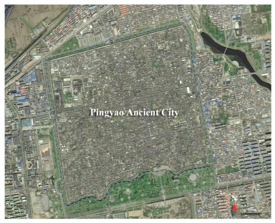 Pingyao Ancient City, located in Shanxi Province, China (37°11′ N, 112°10′ E) (Figure 3), serves as an exemplary case study for heritage city transformation analysis due to its exceptional historical significance, well-preserved urban morphology, and complex contemporary development pressures. Designated as a UNESCO World Heritage Site in 1997, Pingyao represents one of the best-preserved examples of traditional Han Chinese city planning and architecture, encompassing approximately 2.25 square kilometers within its intact Ming Dynasty city walls [] (Figure 4).