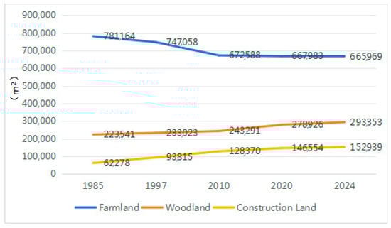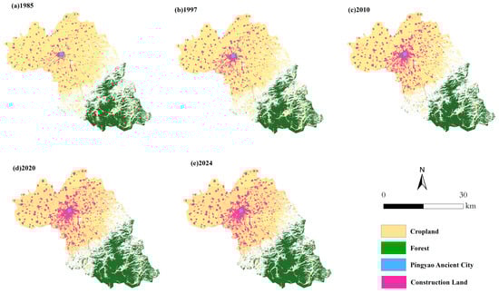 The land use analysis for areas beyond Pingyao Ancient City boundaries employed supervised classification algorithms implemented through ArcGIS 10.8 platform to process the Landsat 5 multispectral datasets. Classification scheme development initially generated five primary land use categories through supervised classification techniques applied to the Landsat multispectral bands. However, for analytical focus and methodological precision, the final classification was consolidated into three core land use types: forestland, cultivated land, and construction land. This simplified classification scheme was selected to capture the most significant land use transitions during China’s reform and opening-up period, particularly those related to urbanization processes, agricultural land conversion, and forest cover changes surrounding the heritage landscape. Temporal change detection analysis was conducted through post-classification comparison techniques to quantify land use transitions and transformation rates across the study periods, enabling comprehensive assessment of regional development patterns in relation to Pingyao Ancient City’s heritage conservation and tourism-driven economic growth (Figure 5, Table 2).