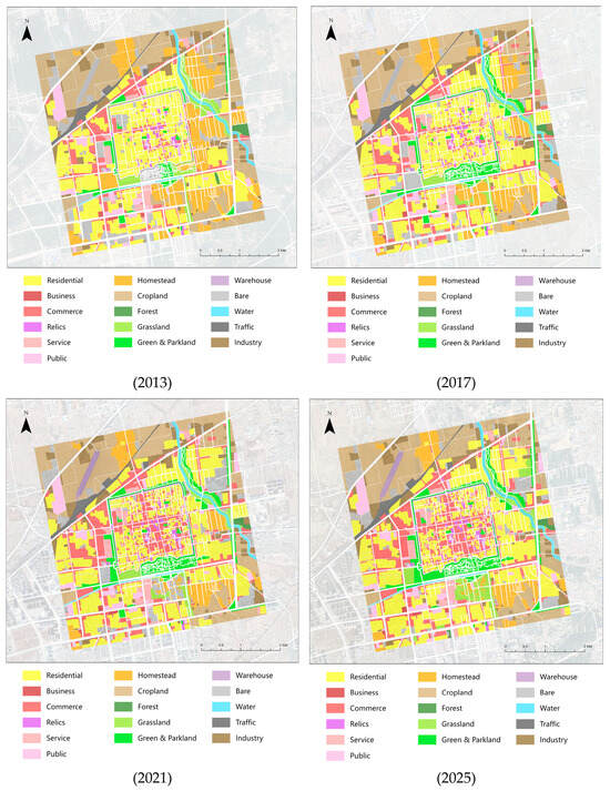 Between 2013 and 2025, the total land area of Pingyao Ancient City remained constant at 2.13 km2, but the internal structure of land use experienced notable adjustments. Residential land declined markedly from 1.459 km2 to 0.818 km2, reflecting the gradual reduction in living space within the heritage zone as stricter preservation regulations limited new construction and some dwellings were converted for non-residential uses. In contrast, commercial land expanded significantly from 0.205 km2 to 0.828 km2 (303%), driven by the adaptive reuse of traditional buildings and the steady growth of tourism-related activities. Service land also increased from 0.031 km2 to 0.097 km2 (213%), corresponding to improvements in infrastructure and visitor facilities. Meanwhile, bare land decreased from 0.085 km2 to 0.024 km2, indicating enhanced land utilization and the restoration of previously vacant plots. Public land and green and parkland grew slightly (0.011→0.016 km2 and 0.036→0.041 km2, respectively), consistent with municipal efforts to optimize public space and environmental quality. The areas of relics (0.131→0.132 km2) and roads (0.173 km2) remained almost unchanged, demonstrating the stability of the city’s historical spatial framework. Overall, these changes suggest a gradual transition from residential and idle land uses toward tourism- and service-oriented functions, shaped by policies emphasizing both heritage conservation and adaptive urban renewal.