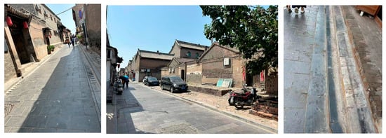 The physical fabric and spatial morphology of Pingyao Ancient City establish essential baseline conditions for assessing visual integrity and tourism impacts. Traditional dwellings and commercial buildings predominantly employ brick-and-timber construction, with load-bearing brick walls (approximately 0.37–0.5 m thick) supporting gray-tiled gable roofs typical of late Ming–Qing vernacular architecture []. Building heights are generally restricted to one or two stories (approximately 4.5–9 m), producing a low-rise urban profile that defines the historical streetscape. The primary streets, including Ming-Qing Street and South Street, range between 6 and 8 m in width, while residential alleys (hutongs) narrow to 2–4 m, creating intimate pedestrian scales conducive to slow movement and social interaction []. Beyond the 6 km city wall (averaging 10–12 m in height), agricultural lands once functioned as a visual buffer, characterized by open fields, tree belts, and irrigation patterns that framed the walled city within its agrarian context []. In recent years, however, modern developments within 1–1.5 km of the city perimeter have altered this visual transition, with residential towers exceeding 20–30 stories introducing vertical contrasts that visually compete with the heritage skyline [].