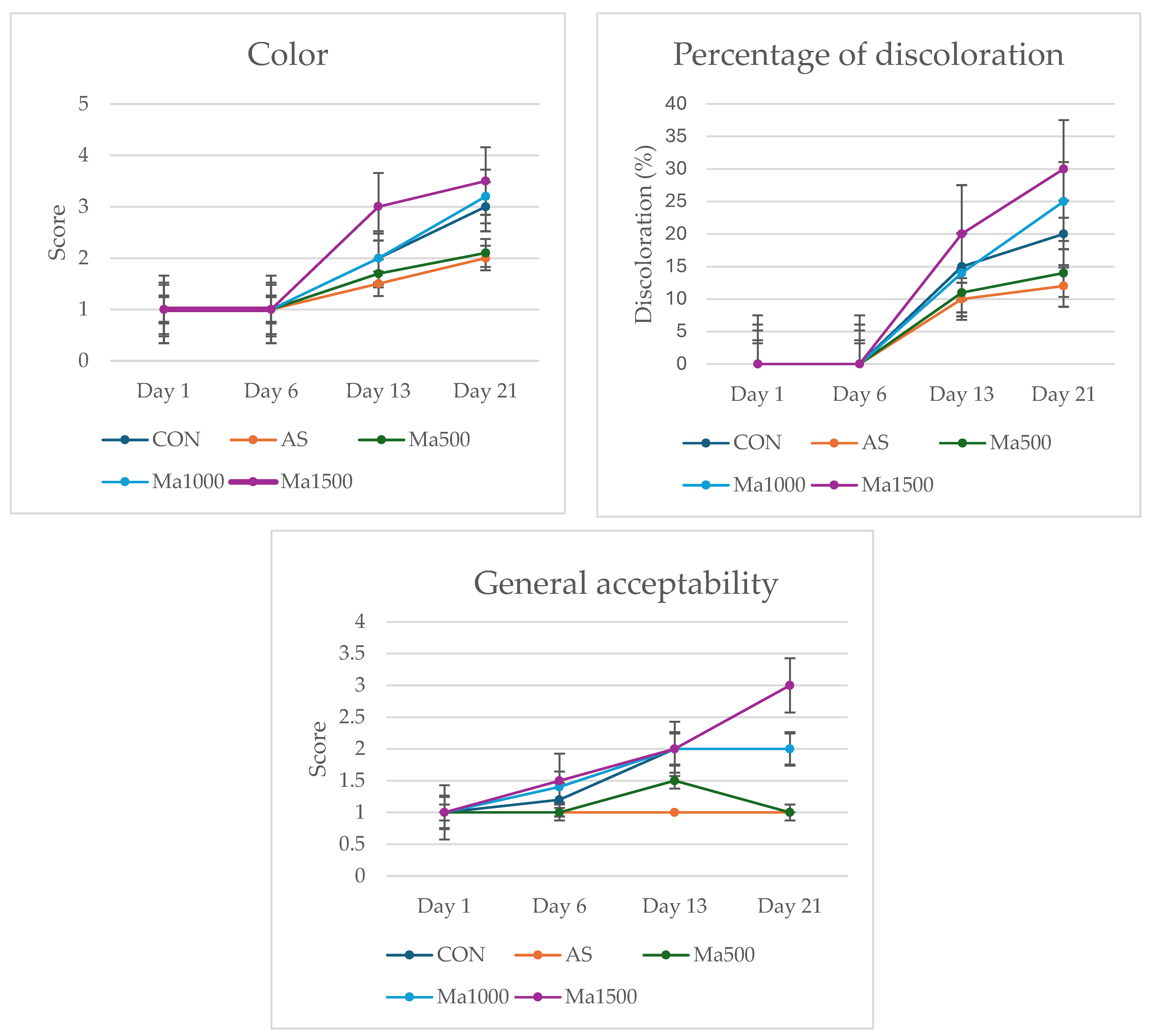 | Treatment | Appearance | Color | Juiciness | Odor | Flavor | Texture | General Acceptability | |