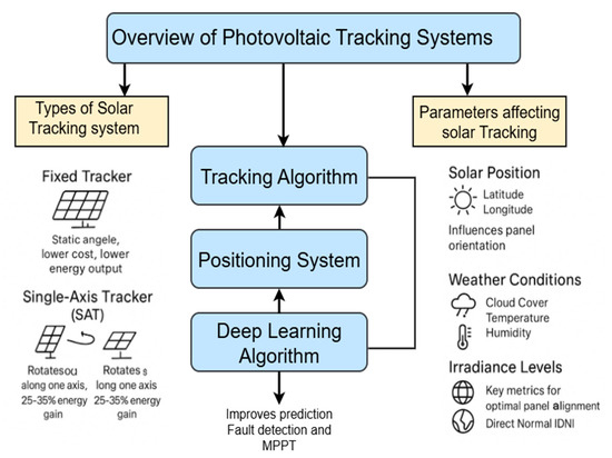 Photovoltaic (PV) solar tracking systems are engineered to enhance the positioning of PV panels with the sun’s trajectory, hence maximising the generation of energy and augmenting overall system efficiency. These devices are essential for optimising the performance of photovoltaic installations by maintaining appropriate panel orientation over the day and across several seasons. The use of technological advances, including deep learning (DL), has transformed the domain, facilitating enhanced predictions, identification of errors, and maximum power point tracking (MPPT). Research indicates that photovoltaic panels equipped with solar tracking technology exhibit superior performance compared to stationary photovoltaic panels [24]. A conventional solar tracker comprises a tracking algorithm, drive mechanism, positioning system, control element, sensor mechanism, and tracking device [25]. The tracking algorithm determines the most optimal angles utilising astronomical tracking algorithms, image processing algorithms, or light-dependent resistor (LDR) based algorithms.