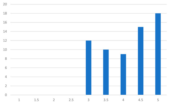 The analysis of the 64 selected papers subjected to the quality assessment criteria is depicted in Figure 3. It can be seen from Figure 3 that the 12 studies scored 3 points, 10 studies scored 3.5 points, 9 studies scored 4 points, 15 studies scored 4.5 points, whereas 18 studies scored 5 points. Therefore, the analysis showed that none of the papers scored below 3 points on the scale, as can be seen in Figure 3. Consequently, the 64 selected papers fulfill the established purpose of this systematic literature review, and it is important to note that no papers were excluded at this stage of the selection process.