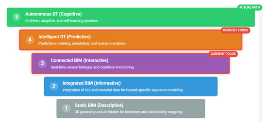 Beyond BIM, DT, a dynamic and interactive model, entails digitizing a physical asset, like a building or infrastructure, and using analytics and real-time data to give information on its maintenance requirements, potential problems, and performance, and updating itself [43]. Deng et al. [44] introduced a five-tier ladder taxonomy that illustrates the transformation from BIM to DT. BIM has rather evolved from static BIM to autonomous DT, where this evolvement is shown on Figure 2.