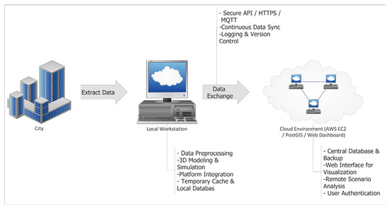 The hardware configuration for this study was carefully selected to balance computational performance, cost-effectiveness, energy efficiency, and scalability. Given the dual nature of the project—requiring both local development and remote accessibility—a hybrid hardware approach was adopted (Figure 3). This comprises a high-performance personal workstation for model development, simulation, and data processing, and a cloud-based server architecture to support real-time access, scalability, and public demonstrations of the DT system.