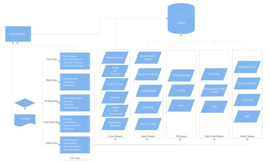Vector layers (building footprints, road centerlines, utilities, administrative boundaries, land use) undergo geometry validation to remove self-intersections and slivers, topology correction to enforce closed rings and planarity where required, and attribute enrichment from authoritative registries. Raster layers (DEM/DTM, satellite imagery, orthophotos, land-cover) are georeferenced, resampled to a project baseline resolution, and tiled for efficient retrieval. Point clouds (LiDAR and photogrammetric) are filtered, ground/non-ground classified, and surface models are derived to reconcile elevation with footprints. Three-dimensional city objects are converted to consistent formats and LoD conventions, where available (e.g., CityGML/CityJSON), semantics are preserved and mapped to the project data dictionary (Figure 4).