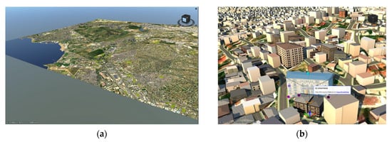 The developed DT model for the Cayirova region functions as an integrated cyber–physical environment that connects the local computational layer, the cloud-based infrastructure, and the sensor network described in Section 2. Once deployed, the DT synchronizes geospatial, structural, and demographic data with the 3D visualization and simulation modules, allowing for real-time updates and continuous interaction between the physical and digital domains. The system’s operation combines automated data ingestion, user-driven simulation, and sensor-based monitoring to provide a unified platform for disaster management and resilience assessment. Figure 7 presents the screenshots taken from the core model.