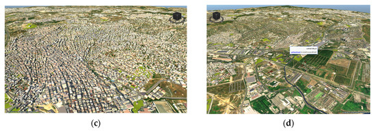 Screenshots of the developed DT model. (a) Overview; (b) Buildings (focused); (c) Buildings (overview); (d) Roads and other features.