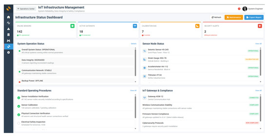 The proper operation of the DT hardware and IoT infrastructure requires adherence to standardized procedures to ensure system reliability, data integrity, and user safety. Before activation, all sensor nodes must be securely installed and calibrated according to the manufacturer’s specifications. Physical and electrical connections, particularly for seismic and structural health sensors, must be verified to prevent erroneous data collection. IoT gateways should be strategically positioned to maintain stable wireless communication with all sensor nodes, and their firmware should be updated to the latest stable release to ensure compatibility and cybersecurity compliance. Figure 9 shows the IoT infrastructure management dashboard showing the operational status of sensors, gateways, and system integrity parameters in the digital twin network.
