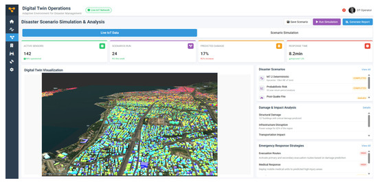 The right-hand panel lists recent simulations and corresponding damage assessments, including predicted structural damage, power outages, and transportation disruptions. Emergency response recommendations—such as evacuation routing and medical resource allocation—are automatically generated based on modeled impacts. The interactive environment supports continuous synchronization with the live IoT network, enabling dynamic updates to predicted damage and system status as new sensor data are received. This operational integration demonstrates the DT’s ability to transition from predictive modeling to adaptive disaster management, providing actionable insights for municipal and emergency stakeholders.