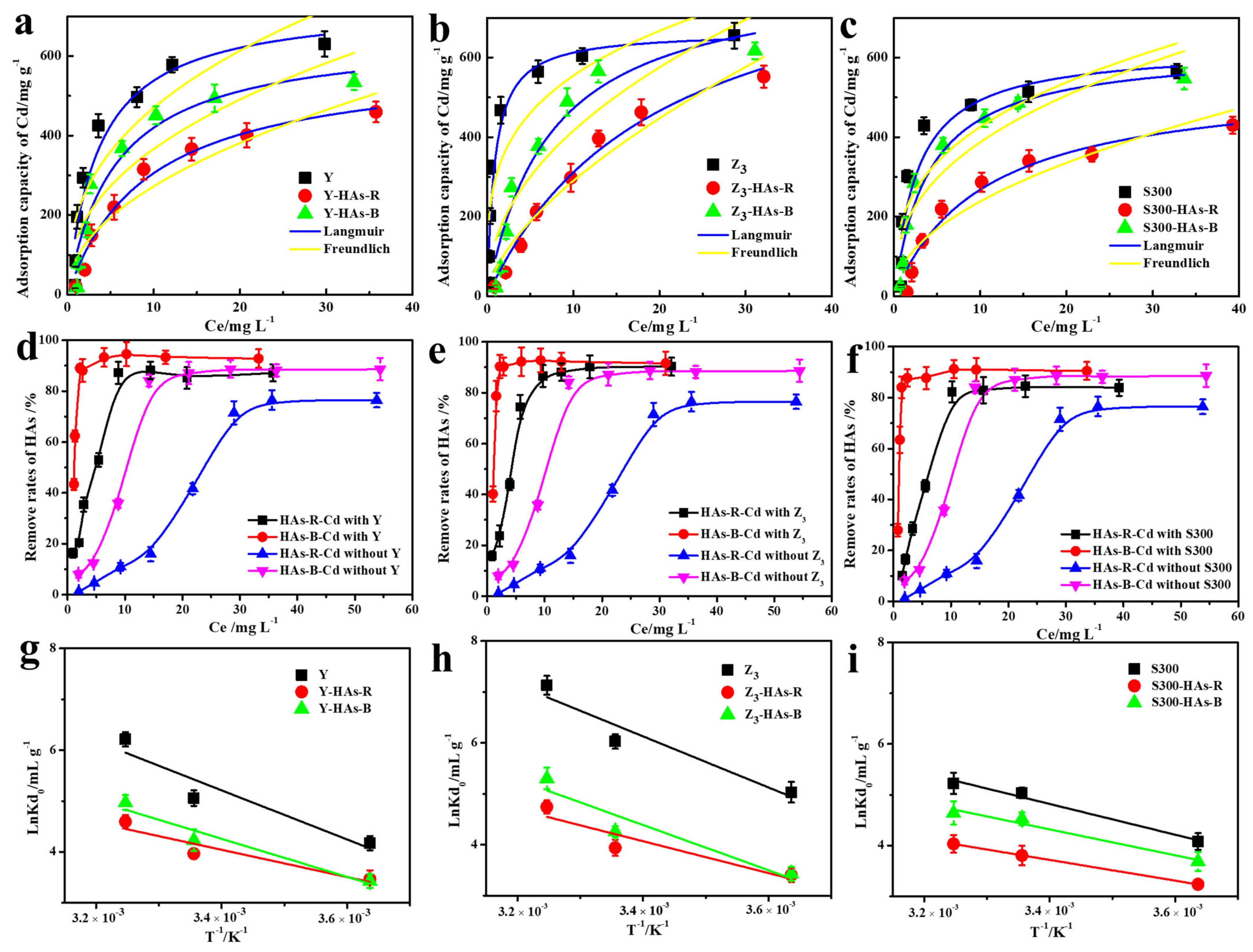 3.2.3. Adsorption Isotherms and Thermodynamics of Cd (II) in the Cuttlebone-Derived Samples with HAs