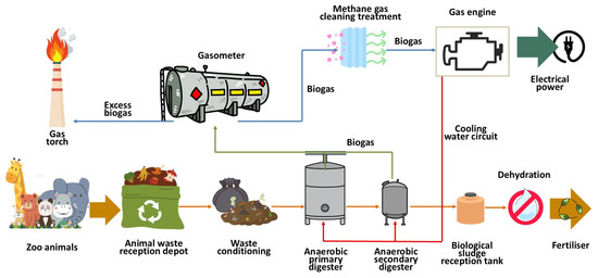 The methane production facility at Madrid Zoo Aquarium consists of simple treatments that, when integrated, transform animal waste into methane gas and solids that can be recovered as organic fertilizer or soil conditioner [42,43] (Figure 1).