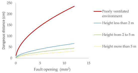 The increase in the dangerous distance with the expansion of the hole that generates the leak follows the same pattern for all gases: