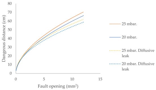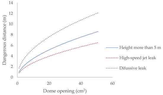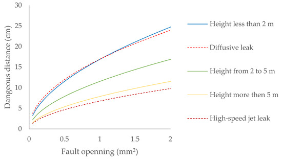 Considering the foreseeable size of the holes that may occur in the different components of the installation [32,33], the hazardous dimensions that must be taken into account are as follows:
