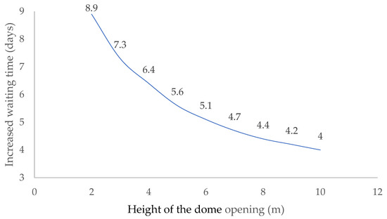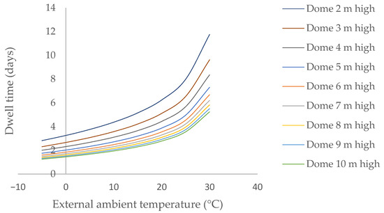 With large temperature differences, even with low domes, good ventilation is induced. The following shows the necessary increase in the number of days that the digestate must remain inside the bioreactor when the ambient temperature has risen from −5.0 °C to 30 °C (Figure 9).
