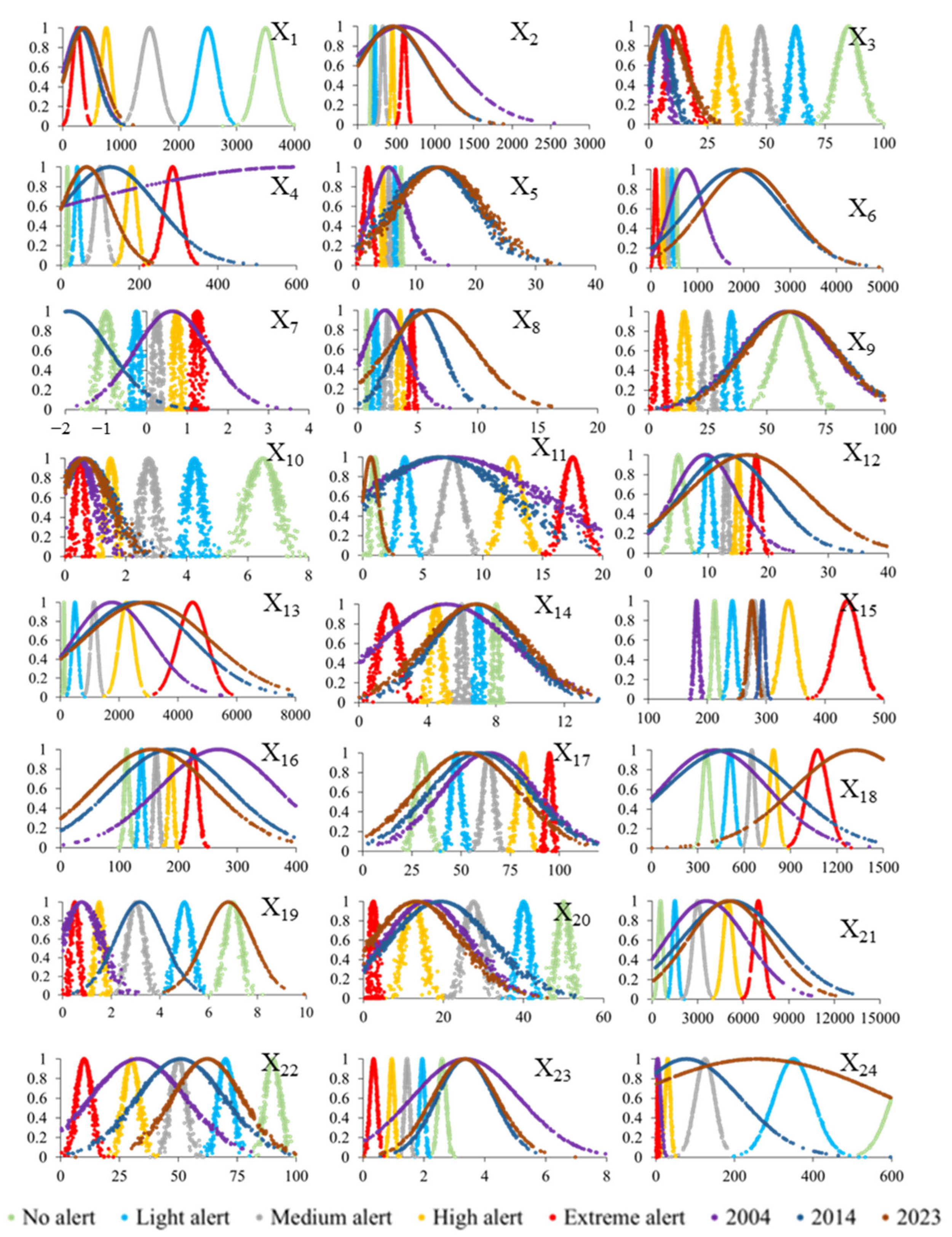 | Ecology sub-system | Industrial sulfur dioxide emissions (tons) | X11 | − | Regional sulfur dioxide emissions | 0–2 [25] | 2–5 | 5–10 | 10–15 | 15–20 | |