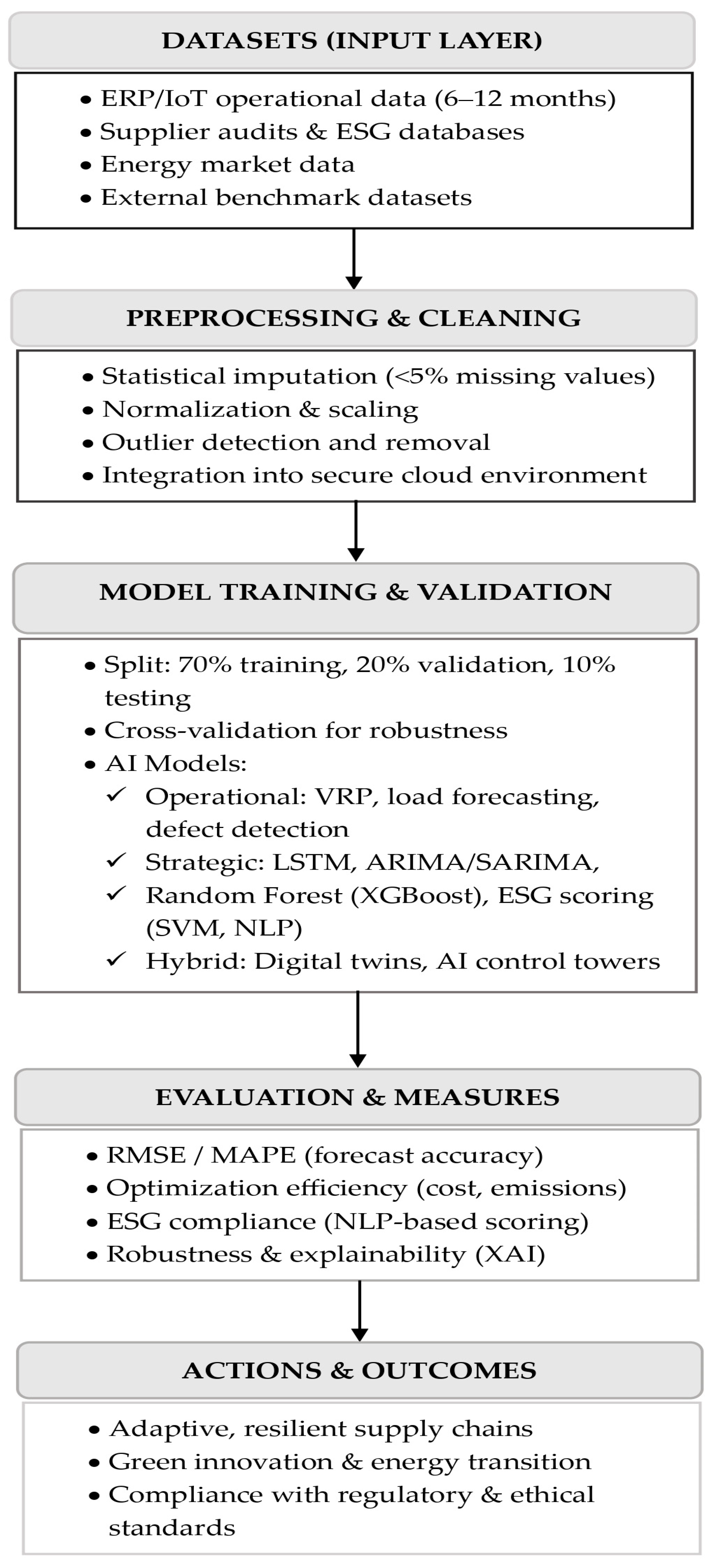 | Sourcing and Supplier Management [33,34] | NLP for ESG report analysis; Supplier Risk Scoring Models (SVM, XGBoost) | Supplier ESG disclosures, audit reports, sustainability ratings, media coverage | Mitigation of Scope 3 emissions through selection of low-carbon suppliers; enhanced supply chain resilience | Dependence on unstructured, often unverifiable third-party data; susceptibility to “greenwashing” |