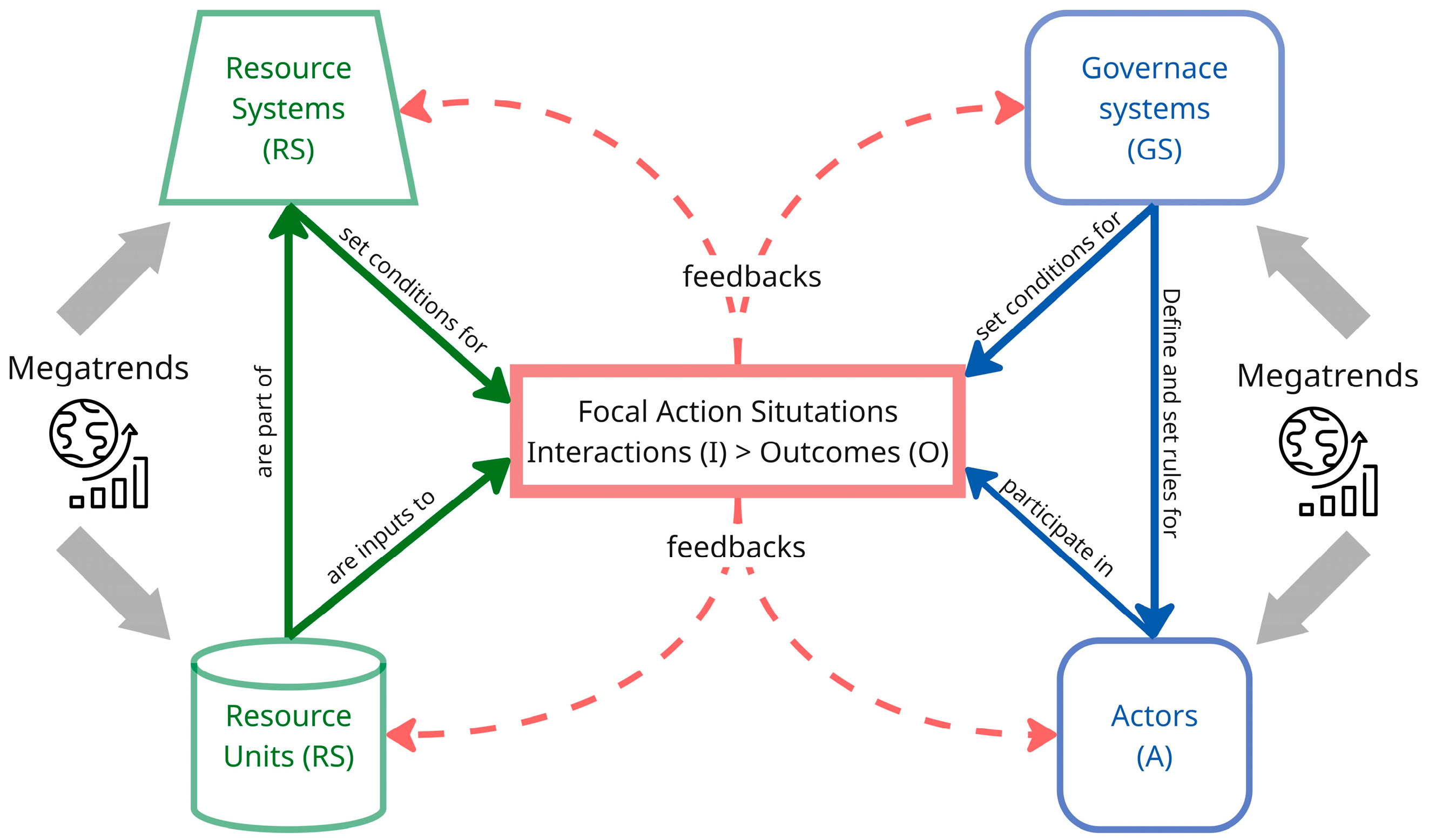 Figure 1. Social-ecological system (SES) framework with components: Resource Systems, Resource Units, Governance Systems, and Actors. Focal Action Situations are where all the action takes place as inputs and are transformed into outcomes (adapted from [1]). Megatrends influence all these sub-systems and their relationships.