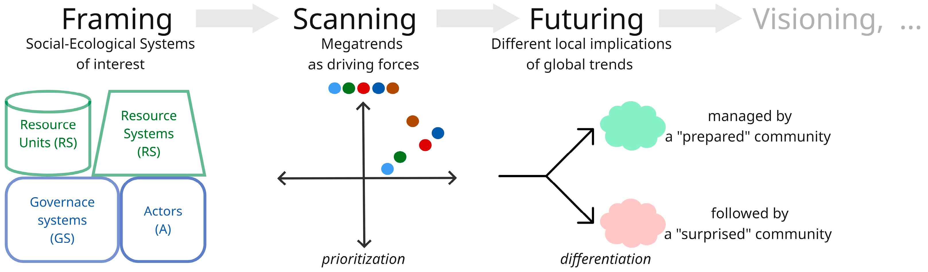 The sequence of these phases follows a deliberate analytical logic: first, diagnosing the structure of the SES (Framing), then identifying external forces shaping its evolution (Scanning), and finally exploring alternative plausible outcomes (Futuring). This progression, summarised in Figure 2, ensures internal coherence between the theoretical frameworks and their operational application.