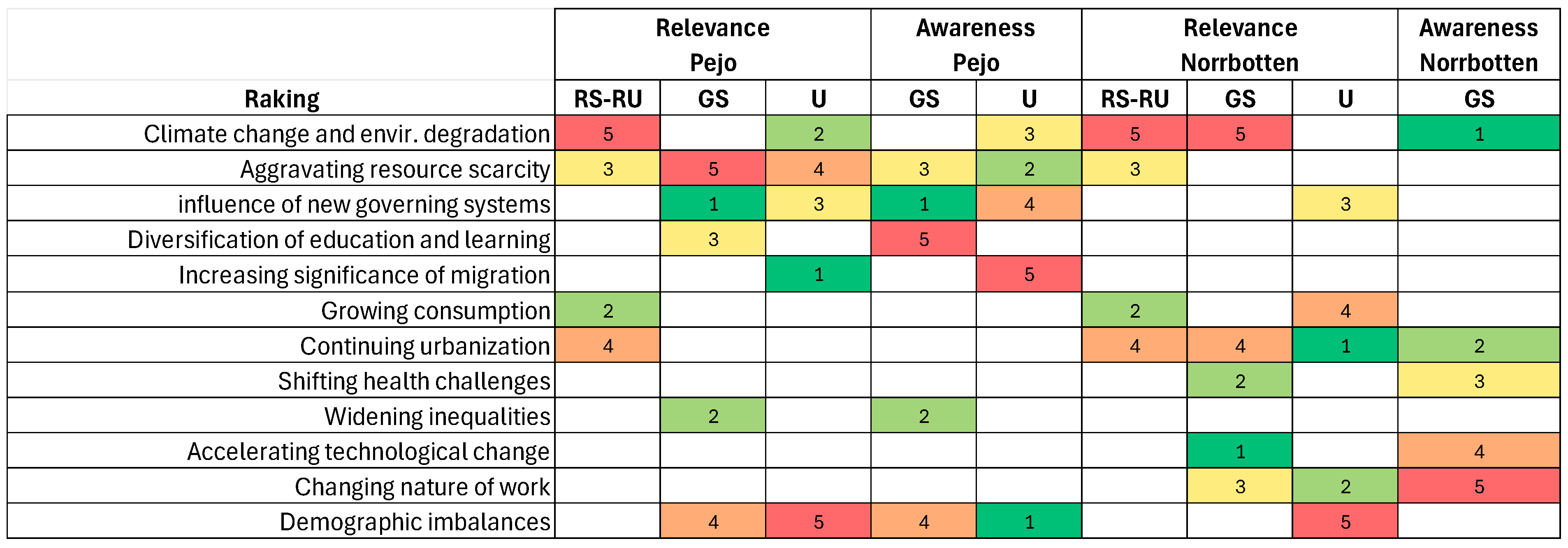 Figure 4. Ranking of megatrend relevance and related community awareness for SES sub-systems (for Norrbotten U-User sub-system, ranking was omitted due to information scarcity). The colored gradients highlight the order in the ranking (where red represents the highest score, and therefore the top positions in the ranking).