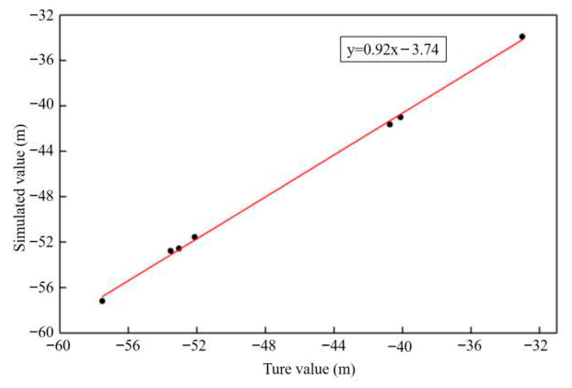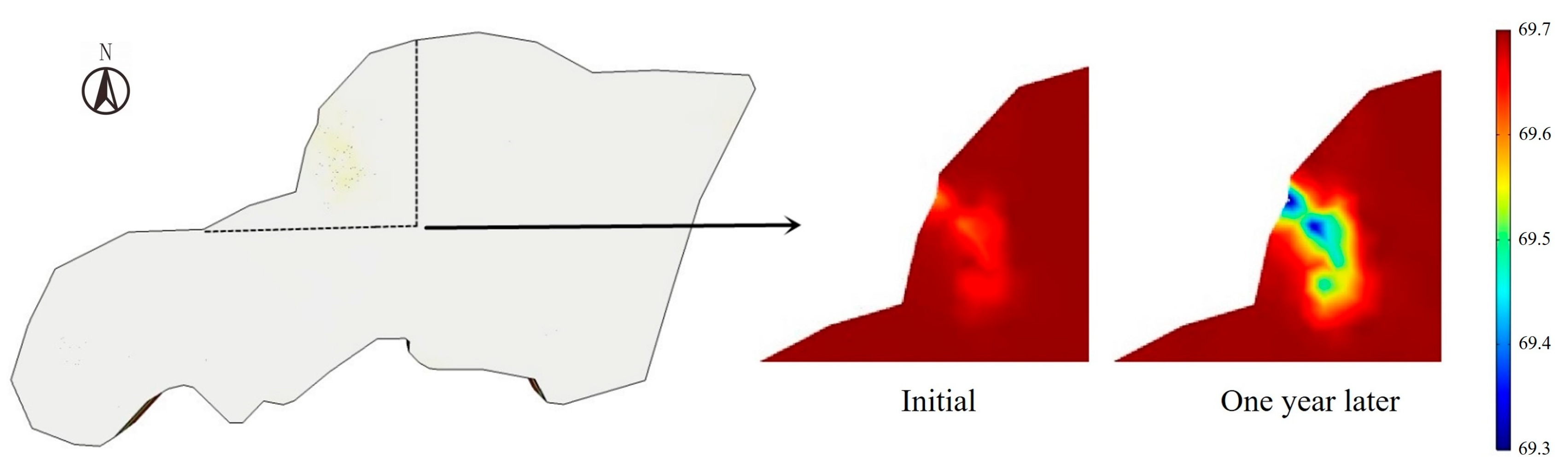 - Under current conditions, a pronounced geothermal water-level depression funnel has developed in the urban area of Linqing. The water level declines by approximately 7.4 m within one year and by 32.7 m at the center of the funnel within ten years, while the affected area gradually expands. Without effective reinjection, the reservoir experiences continuous pressure attenuation, which threatens the long-term stability of the system.