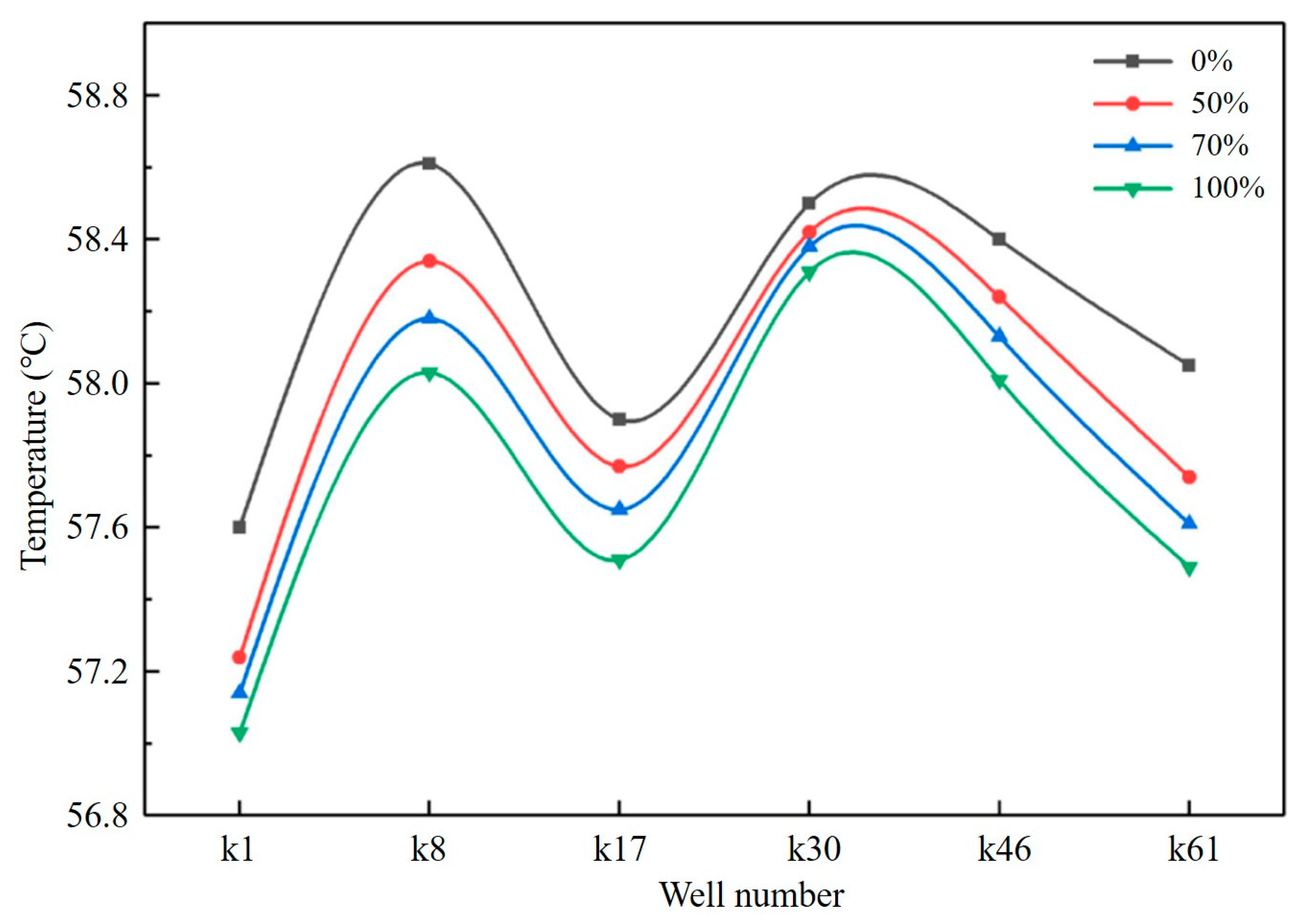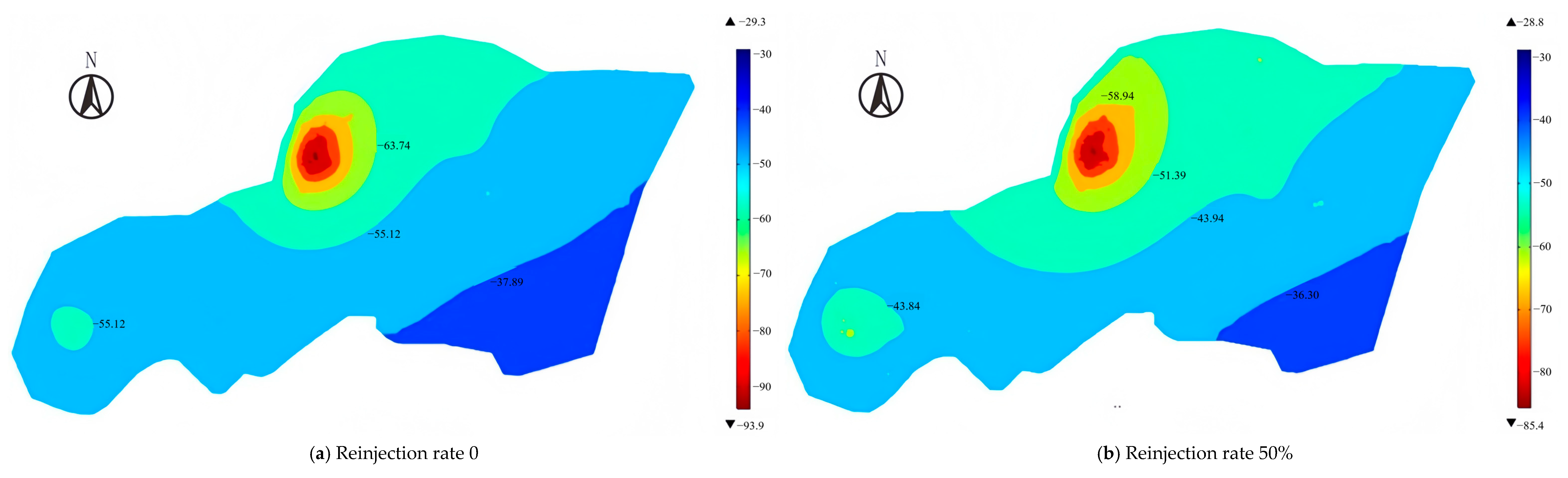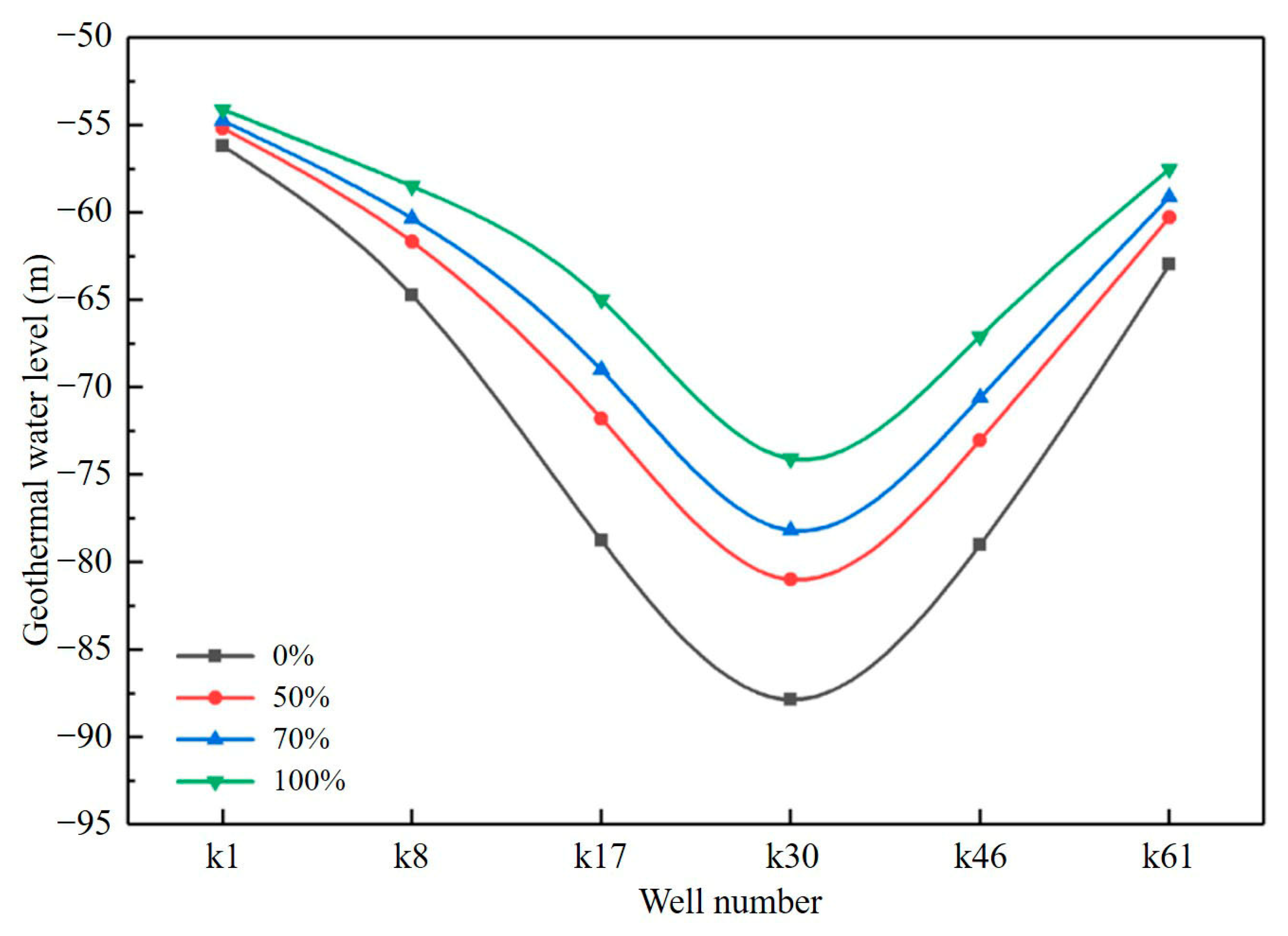 - The reinjection rate exerts opposite effects on the flow field and the temperature field. When the reinjection rate increases from 0% to 100%, the water-level decline at the center of the depression funnel slows from 36.4 m to 19.3 m over a ten-year period. However, the minimum reservoir temperature decreases from 65.0 °C to 63.6 °C, and the extent of the low-temperature zone expands from 2.24 km2 to 11.61 km2.