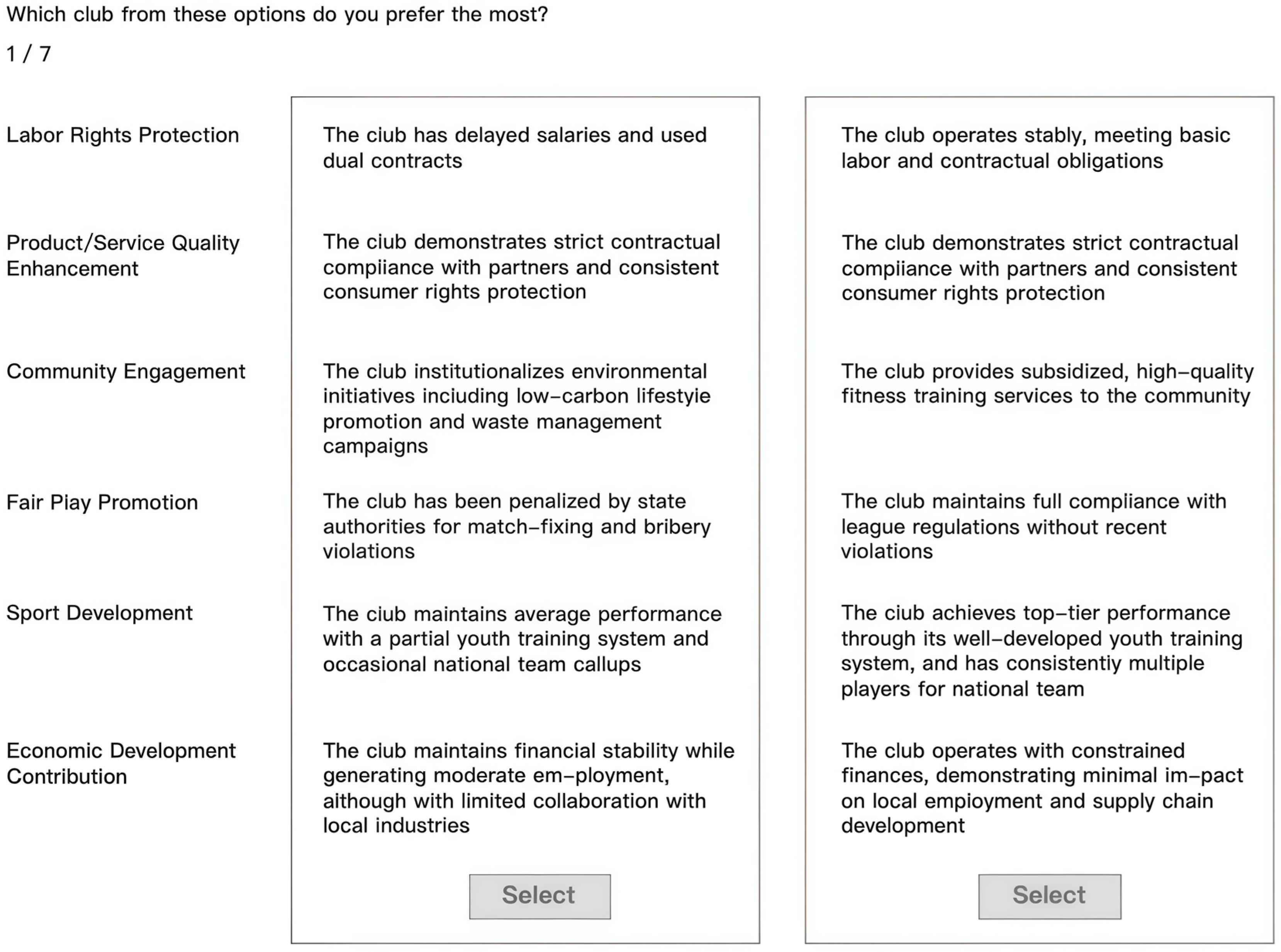 For the attribute of labor rights protection, in light of persistent issues in Chinese professional sports clubs, such as delayed payment of salaries and the use of dual contracts [40], this attribute is operationalized into three levels: (1) “The club has occasionally been reported for delayed salary payments or signing dual contracts with employees in recent years”; (2) “The club operates stably, ensuring basic labor rights, such as contracts and social security for employees”; and (3) “Employees actively participate in the club’s governance, enjoy harmonious labor relations, with the club providing strong career development opportunities”.