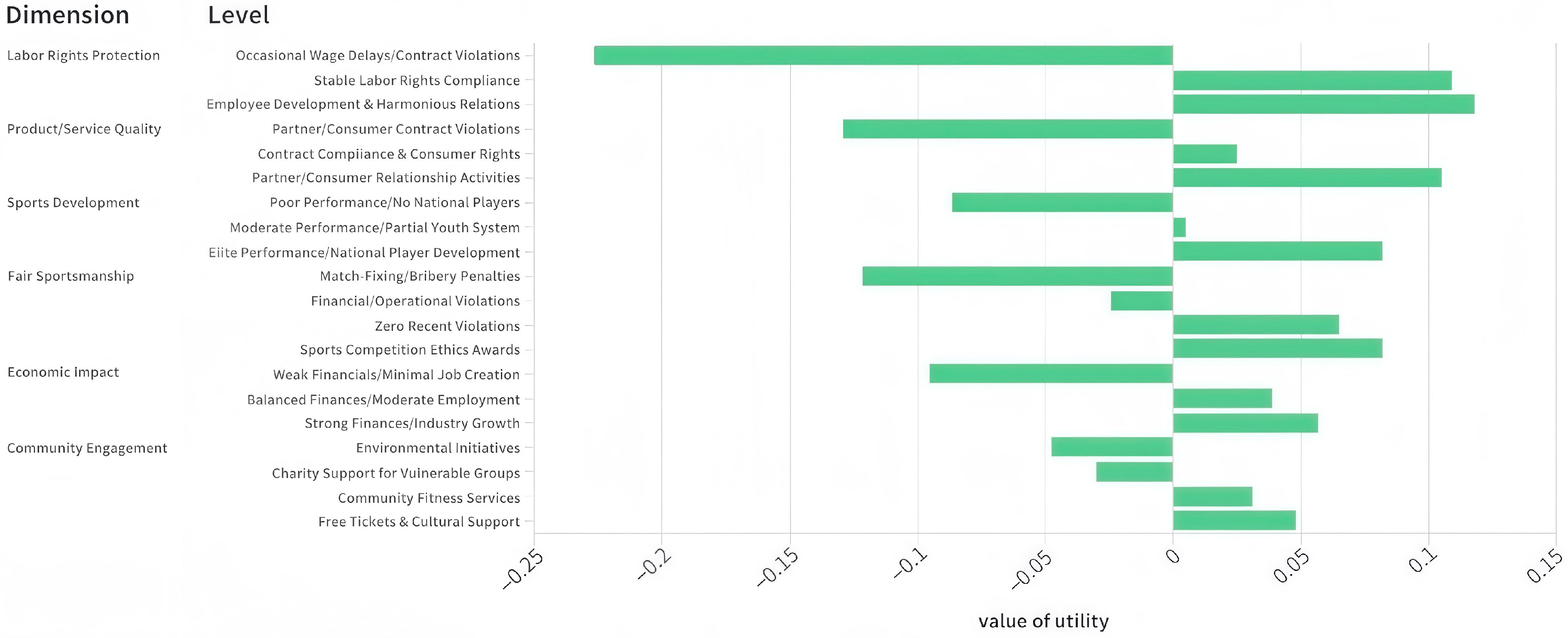Similarly, the average utility values for different CSR activity types within each attribute were calculated across all respondents, reflecting their relative influence on decision-making. The results show that the utility of labor rights protection ranges from −0.227 to 0.118 (span = 0.345), product/service quality enhancement from −0.130 to 0.105 (span = 0.235), fair play promotion from −0.122 to 0.082 (span = 0.204), sport development from −0.087 to 0.082 (span = 0.169), economic development contribution from −0.096 to 0.057 (span = 0.153), and community engagement from −0.031 to 0.048 (span = 0.079).