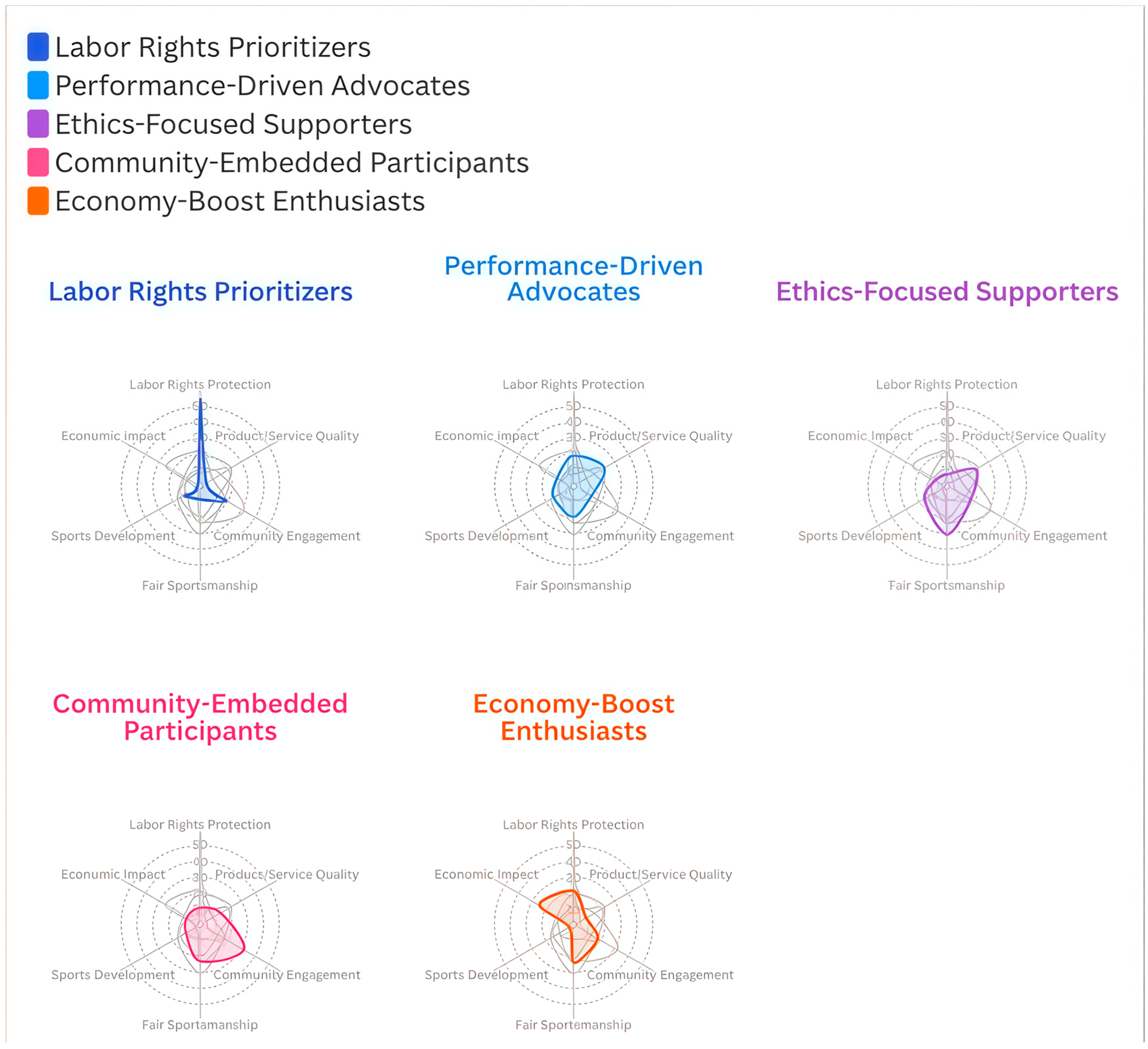 Figure 4 shows the average importance levels of the CSR attributes across the five groups. The Labor Rights Prioritizers type respondents displayed a preference structure dominated by a single dimension, placing strong emphasis on whether clubs effectively safeguard labor rights protection (54.67%), followed by community engagement (18.97%). This group primarily consisted of individuals aged 26 to 40 years, and many of them worked as lawyers, teachers, and manual laborers.