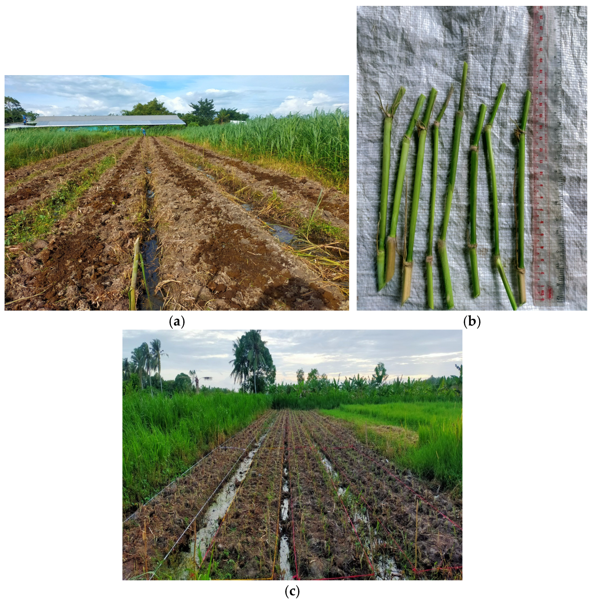 - Can, T.M. Effect of Harvesting Time on Growth, Yield, and Chemical Composition of Para Grass (Brachiaria mutica) Planted in Vinh Long Province, Vietnam. Undergraduate Thesis, College of Agriculture, Can Tho University, Can Tho, VietNam, 2021. (In Vietnamese). [Google Scholar]