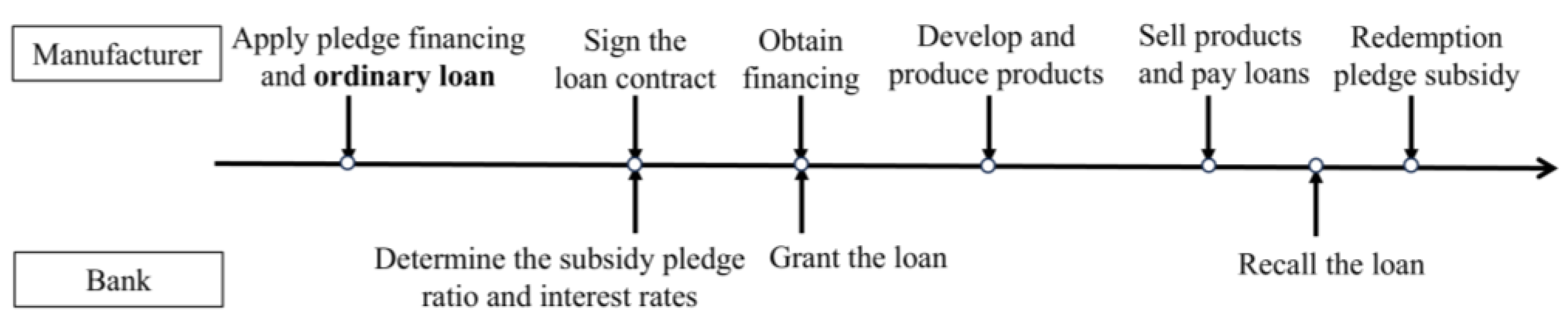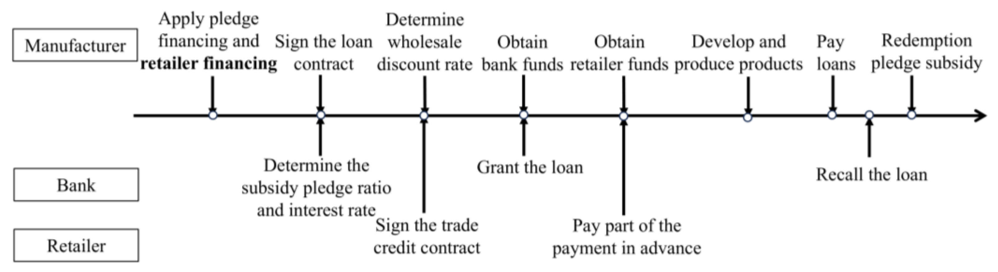 To address these research questions, this study employs a two-echelon green supply chain framework comprising a manufacturer and a retailer. Under the condition of delayed subsidy disbursements, we consider how a capital-constrained manufacturer utilizes subsidies for pledge financing. Based on whether pure subsidy pledge financing can fully cover the manufacturer’s funding gap, we develop three analytical models: pure subsidy pledge financing, hybrid pledge financing, and a non-financing benchmark scenario. This framework allows us to analyze the manufacturer’s optimal financing strategy choices and their corresponding operational decisions under different financing approaches. Furthermore, we compare the impacts of different financing modes on consumer surplus and government benefits.