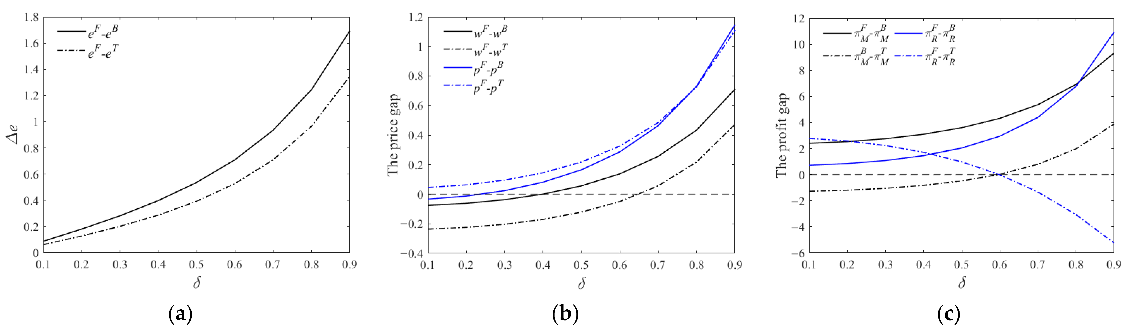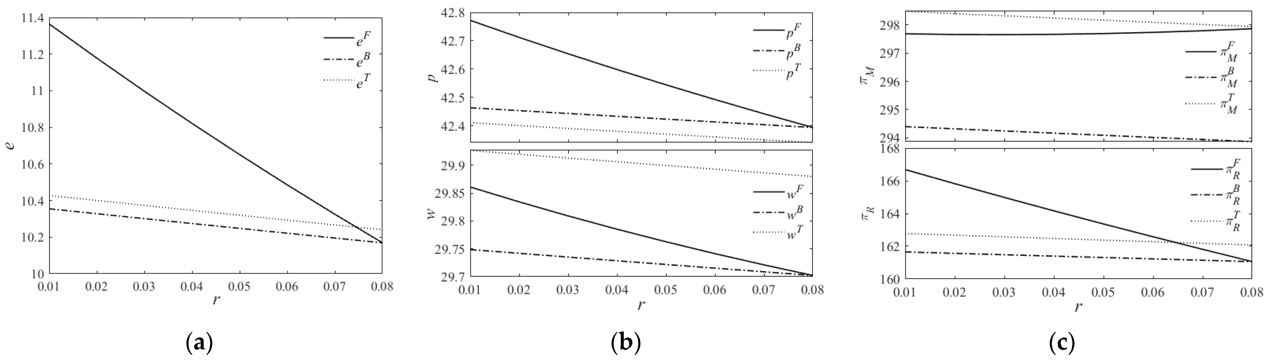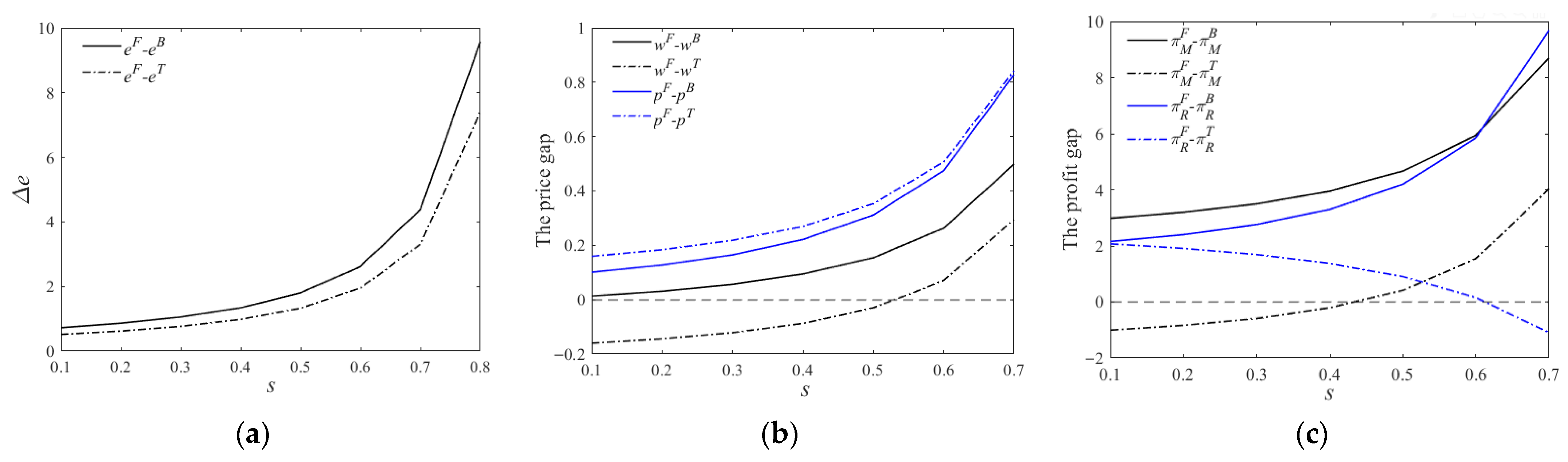 As established in Proposition 6, supply chain members optimize pricing strategies to maximize economic benefits under varying conditions. Under Strategy F, the relatively lower financing pressure enables more flexible and favorable pricing decisions. In contrast, hybrid financing strategies exhibit distinct trade-offs: when financing costs are high, constrained R&D budgets compel the supply chain to implement price reductions to stabilize market share; conversely, when financing costs are relatively low, while cost transfer through wholesale price increases becomes feasible, such pricing adjustments risk demand suppression and consequent profit erosion. Therefore, Manufacturers should coordinate pricing with retailers to maintain stable demand rather than unilaterally raising wholesale prices under financing pressure. Retailers, in turn, should strategically employ marketing efforts to cushion demand-side impacts when accepting necessary price increases to ensure supply continuity.
