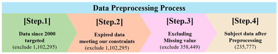 First, patents filed since 2000 were selected from the KIPRIS database according to axiom 1. This is because the KIPO commenced its digitalization in 1999 through the implementation of an online patent application system named ‘Patents-net. In contrast, patents filed prior to 1999 were collected manually, which were more prone to data errors such as missing values or outliers. According to [41], replacing missing values (e.g., using the median or mean of the entire dataset) in cases of high proportions of missing data may reduce overall data quality. Consequently, 397,871 patent data points were excluded.