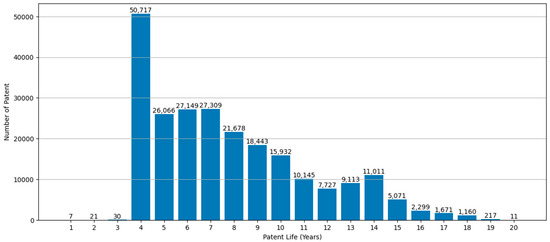 Figure 2 presents a graph visualizing the number of patents corresponding to each annual patent life of up to 20 years. The observation that the number of registered patents decreased sharply as the number of years increased implied a high correlation between rapidly increasing annual patent maintenance fees and the number of patents. This can be interpreted as evidence supporting the hypothesis that maintaining a patent for a long duration in cases of low patent quality is challenging.