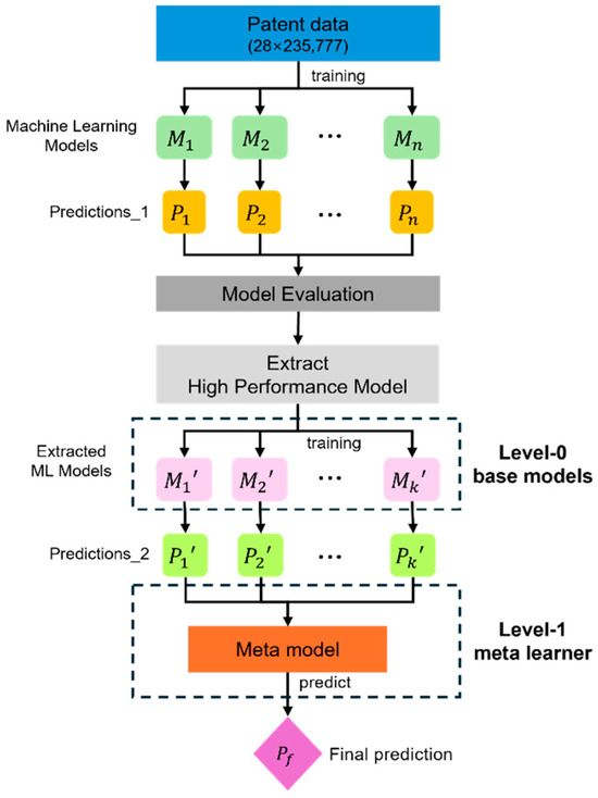 The stacking technique is a meta-learning approach that combines predictions from multiple base learning models as new inputs to build a model, subsequently training a meta model to produce the final prediction [35]. Stacking technique has proven to be more effective in terms of predictive performance compared to single learning models. Ref. [35] proposed a stacking ensemble model using the SMOTETomek technique to predict major adverse cardiovascular events (MACE) in patients with acute coronary syndrome (ACS), concluding that this stacking ensemble model achieved improved predictive performance compared to methods using only single machine learning models. In [36], four individual learning models (gradient boosted model, distributed random forest, generalized linear model, and deep neural network) were used as base-learners for breast cancer classification. Their predictions were combined as inputs for a meta-learner, with results showing that the gradient boosted model as a meta-learner achieved the highest predictive performance. Ref. [37] proposed the Stacking Ensemble Learner (SEL) model to predict emergency readmissions for heart failure patients, using 13 classical machine learning models as base-learners and XGBoost as the meta-learner. This stacking model achieved superior predictive performance over single machine learning models. Meanwhile, the stacking ensemble technique has not been widely utilized in patent domain. Ref. [38] noted the scarcity of studies utilizing stacking ensemble techniques in patent classification, presenting and comparing various stacking ensemble frameworks for this purpose. Ref. [39] proposed an ensemble method to address the issue of imbalanced patent data, partitioning the dataset by high- and low-frequency codes before training and stacking ensemble the results, which improved the accuracy of a single classification model by approximately 6%.