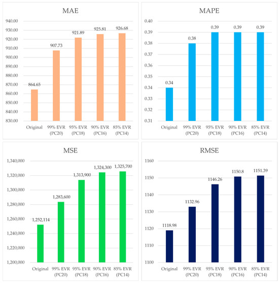 Figure 5 implies that the original dataset-based model outperformed all four PCA-based dimensionality reduction models. Among the models trained on PCA-transformed datasets, the PC20 model achieved the highest performance. However, when compared to the model trained on the original dataset, it failed to achieve superior performance across all evaluation metrics. Notably, in terms of MAE, the error was approximately 43 units higher than that of the original dataset-based model. Given that the primary objective of the proposed model is to achieve high predictive performance, the original dataset-based model was deemed more suitable for this study’s objective. Therefore, the proposed model was ultimately trained on the original dataset.