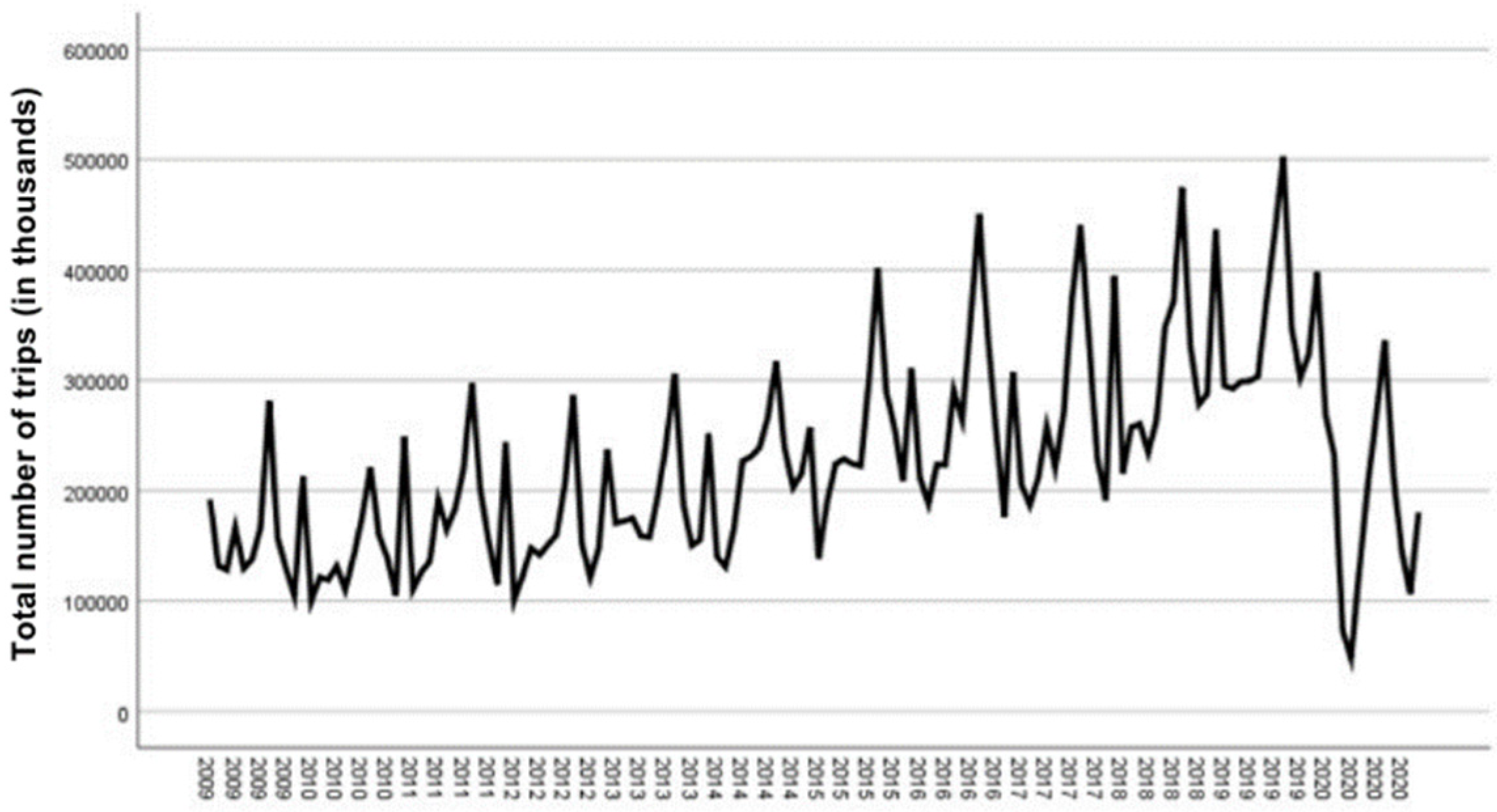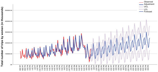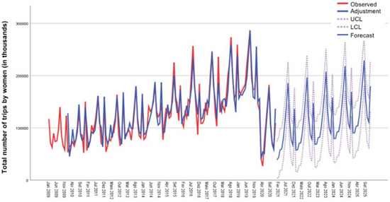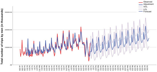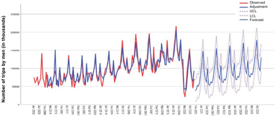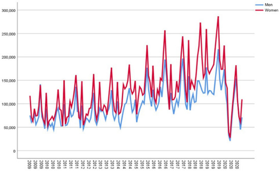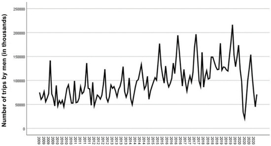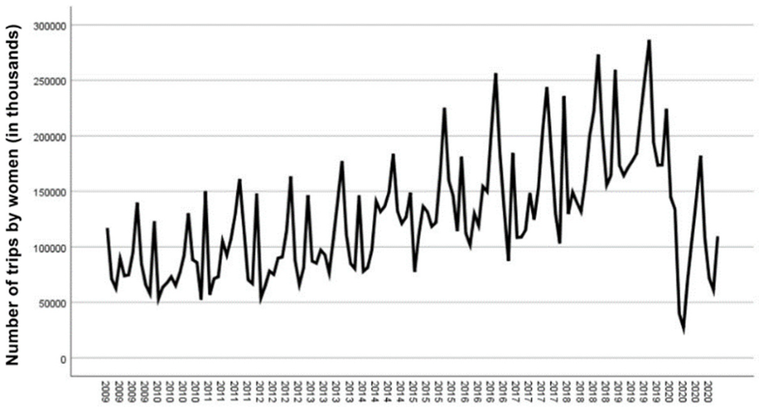 In the second stage, our focus changed to a more detailed analysis of time series, with monthly data collected between 2009 and 2020, equivalent to 144 observations. Initially, we carried out a graphical analysis to identify the three basic components of each series: trend, seasonality, and random behaviour. Furthermore, we applied the Student’s t-test to compare travel patterns between men and women.