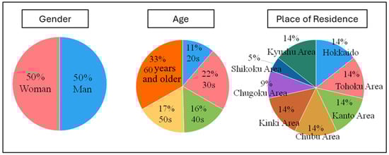 The decision to use a web survey was based on its efficiency and broad reach, making it ideal for collecting reliable data over a large geographical area. This method also allowed for efficient distribution and collection of responses in a short timeframe. The survey was conducted on 24 and 25 November 2023, yielding 6210 valid responses, providing a robust dataset for analysis. The questionnaire survey was evenly distributed based on gender, age, and place of residence, as shown in Figure 1, and samples were collected equally from all seven regions of Japan to ensure national representativeness. This balanced design was carefully implemented to improve the quality and reliability of the survey results and to minimize potential bias. However, socially isolated individuals, elderly individuals (aged 70 and above), and those with limited internet access might be slightly underrepresented, which is a common limitation of web-based surveys. This potential bias has been acknowledged in interpreting the results, and future research should combine online and offline data collection to enhance inclusivity.
